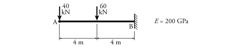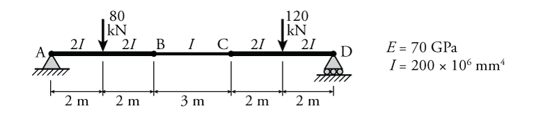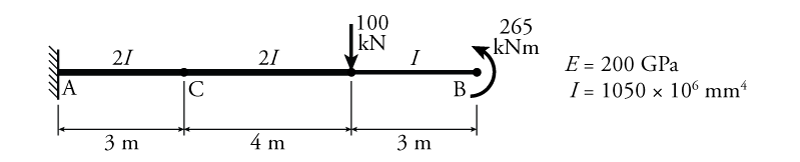 - For the beam shown below, determine the deflection at point C ($\Delta_C$) using the virtual work method.