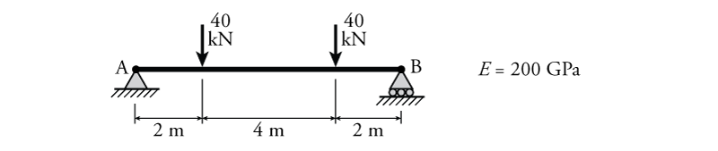 - For the beam shown below, determine the minimum moment of inertia ($I$) such that its deflection does not exceed $\frac{L}{360}$.