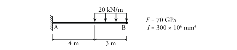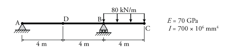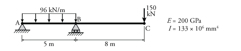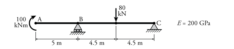 - For the beam shown below, determine the slope at midspan ($\theta_{mid}$), slope at point B ($\theta_B$), deflection at midspan ($\Delta_{mid}$) and deflection at point B ($\Delta_B$) using the moment area theorems.