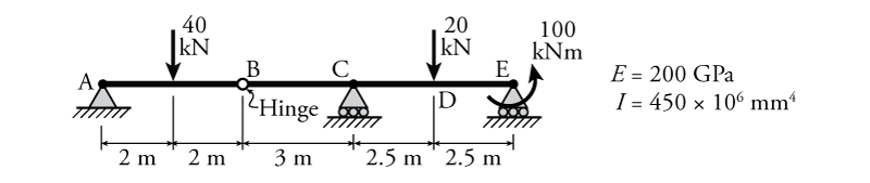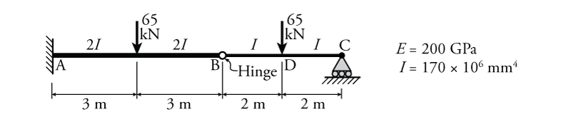 - For the beam shown below, determine the slope to the left of the hinge at point B ($\theta_{B,left}$), slope to the right of the hinge at point B ($\theta_{B,right}$), deflection at point B ($\Delta_{B}$) and deflection at point D ($\Delta_D$) using the moment area theorems.