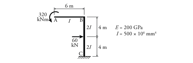 - For the frame shown below, determine the vertical deflection at point C ($\Delta_C$) using the virtual work method.