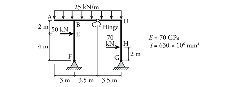 - For the frame shown below, determine the rotation at point D ($\theta_D$) and the horizontal deflection at point E ($\Delta_E$) using the virtual work method.