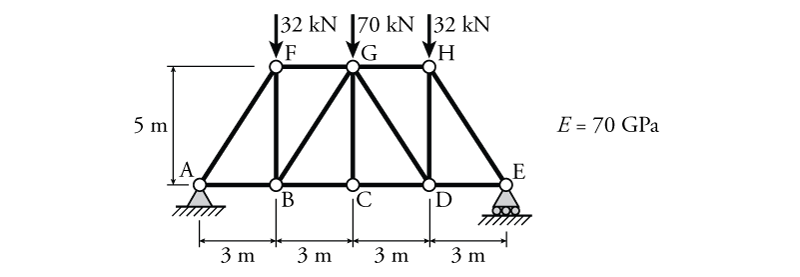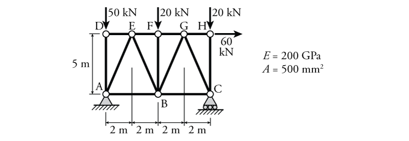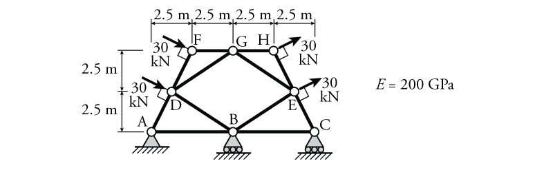 - For the truss shown below, use virtual work to determine the minimum cross-sectional area ($A$) such that the horizontal deflection at point H ($\Delta_H$) does not exceed $20\mathrm{\,mm}$.