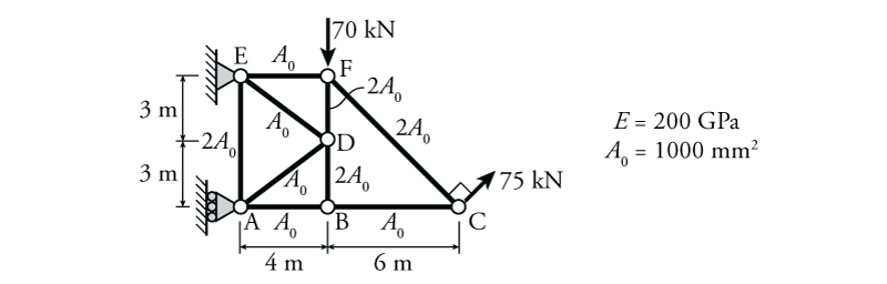 - For the truss shown below, use virtual work to determine the minimum cross-sectional area ($A$) such that the vertical deflection at point C ($\Delta_C$) does not exceed $35\mathrm{\,mm}$.