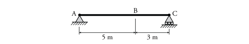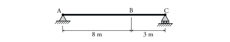 - For the beam shown below draw the influence lines for $A_y$, $C_y$, $V_B$ and $M_B$ using the equilibrium method. Find the maximum possible value of $A_y$ if a $32\mathrm{\,kN/m}$ distributed load and a single $50\mathrm{\,kN}$ point load may be placed anywhere on the beam.