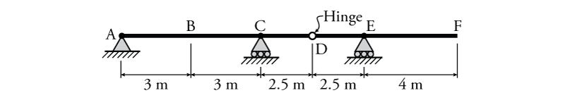 - For the beam shown below draw the influence lines for $A_y$, $C_y$, $E_y$, $M_B$ and $V_D$ using the equilibrium method. Find the maximum possible value of $V_D$ if a $32\mathrm{\,kN/m}$ distributed load and a single $50\mathrm{\,kN}$ point load may be placed anywhere on the beam.
