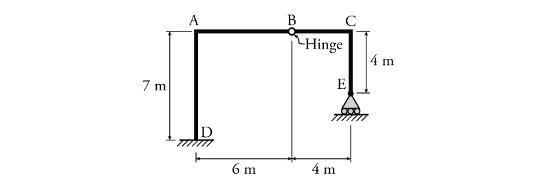 - For the frame shown below draw the influence lines for $D_y$, $E_y$, and $M_D$ using the equilibrium method.