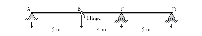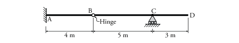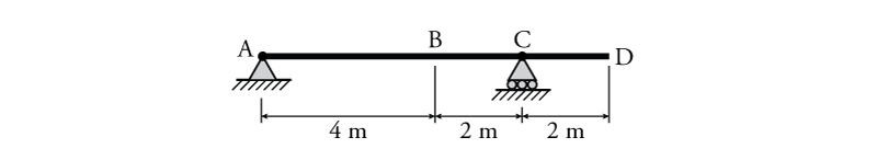 - For the beam shown below draw the influence lines for $B_y$, $D_y$, $V_C$ and $M_C$ using the equilibrium method. Find the maximum possible value of $M_C$ if a $32\mathrm{\,kN/m}$ distributed load and a single $50\mathrm{\,kN}$ point load may be placed anywhere on the beam.