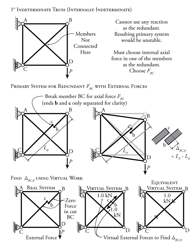 To find the value of the overlap $\Delta_{BC,0}$ we can use the method of virtual work from Chapter 5. The real system for this virtual work analysis is simply the primary system with the external load applied (and no force in members Cc and Bb since they are no longer connected axially). This is a determinate truss that is easy to analyse. The virtual system will be the same primary system, without the external force $P$, but instead with virtual external unit loads applied at each cut end at b and c. This pair of virtual unit loads is in the same location and direction as the unknown that we want to find, i.e. the overlap of the two cut ends at b and c. Having two unit loads in opposite directions instead of a single unit load will mean that the virtual work method will result in the relative movement of the two ends instead of the absolute deflection of either end. The real and virtual systems for finding $\Delta_{BC,0}$ are shown at the bottom of Figure 8.13.