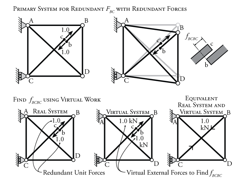 where $\Delta_{BC,0}$ is the overlap or gap between cut ends b and c in the primary system caused by the external force on the truss, $f_{BCBC}$ is the overlap or gap between cut ends b and c in the primary system caused by the unit redundant internal axial force at the location of the cut ends, and $F_{BC}$ is the total redundant internal axial force in member BC. If $\Delta_{BC,0}$ causes an overlap between b and c, then $F_{BC}$ must create an equal and opposite gap between b and c that is equal to: