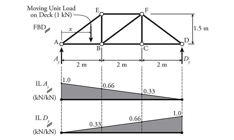 An example truss is shown in Figure 6.12. This truss supports a bridge and the deck of the bridge is concurrent with the bottom chord of the truss. So, the path for the moving unit point load is along a line joining points A and D. The distance $x$ is the distance of the moving load from point A. Find the influence lines for the three members EF, BF and BC.