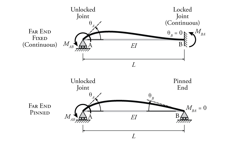 The key step of the moment-distribution method is the unlocking of each node and the redistribution of the unbalanced moment at that joint to all the members that are connected to it, based on relative rotational stiffness of each member. So, we need to be able to calculate the rotational stiffness of a member connected to a rotating joint, which will depend on the Young's modulus $E$, the moment of inertia $I$ and the length of the member. Like the slope-deflection method from Chapter 9, we would also like to take advantage of the extra information provided by pinned ends if we can, since we know ahead of time that the moment at such pinned ends must be zero. Hardy Cross's original method as described in the original paper does not take advantage of such additional information, but it will save us time and effort to do so. This means that the stiffness will also depend on the type of boundary condition at the opposite end of the member, whether it is fixed or pinned. Note that the pinned end condition only applies to pinned ends where the moment is zero.