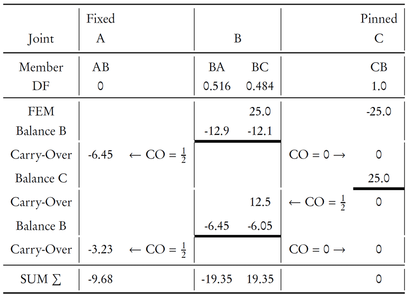 So, we will move onto node C as shown in Table 10.1. The first step again is to unlock/release the node and balance the unbalanced moment. At node C, there is only one previous unbalanced load which was caused by the fixed end moment ($-25\mathrm{\,kNm}$); however, if there was a non-zero carry-over moment from the balancing of node B, then the total unbalanced moment for node C would be the sum of the original fixed end moment and the carried-over moment. The total counterbalancing moment for the unbalanced moment at node C is, therefore, $+25\mathrm{\,kNm}$ which is applied entirely to member CB (since it is the only member at the node and the distribution factor is 1.0). Since all the moments at node C are now balanced, there is a horizontal line drawn underneath the counterbalancing moment. Then, since the opposite end of that member, at node B, is fixed, we need to carry over half of the counterbalancing moment to the other end of member BC at node B ($+12.5\mathrm{\,kNm}$), as shown in the table.