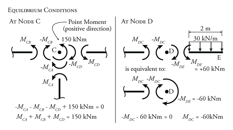 The next step in the analysis is to find an equilibrium equation for each degree-of-freedom. For this problem, the moment equilibrium for nodes C and D are shown in Figure 9.13. At node C there are three different members that frame into it, members CA, CB and CD. Each of these members has an unknown end moment $M_{CA}$, $M_{CB}$ and $M_{CD}$ as shown in the figure. These unknown moments are considered to be positive at the member ends (counter-clockwise). The moments caused by each of these members on node C itself are also shown. Since the members here are cut just beside the node, the moments on the node itself will have an equal magnitude but opposite direction to the moments at the member ends ($-M_{CA}$, $-M_{CB}$ and $-M_{CD}$ as shown in the figure). In addition to these moments that the member ends apply to the node, node C also has a clockwise point moment applied directly to it of $+150\mathrm{\,kNm}$. This point moment is also shown in the figure.