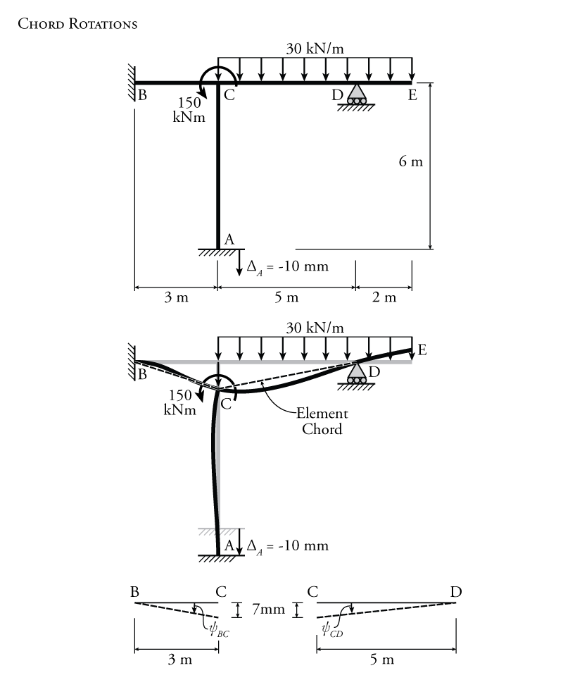 The rotation for each chord may be calculated as shown in Figure 9.14. For member BC, the chord rotation is: