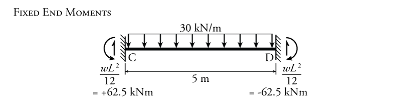 \begin{align*} \text{FEM}_{CD} &= +62.5\mathrm{\,kNm} \curvearrowleft \\ \text{FEM}_{DC} &= -62.5\mathrm{\,kNm} \curvearrowright \end{align*}