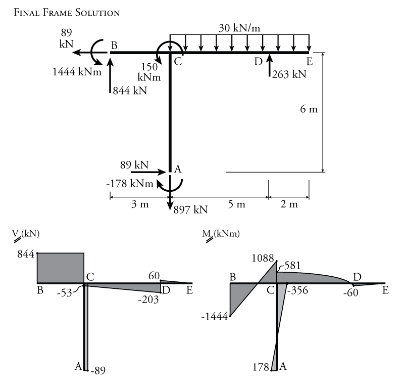 Axial forces and shear forces at support locations can then be used to find the reaction forces. The complete resulting free body diagram for the entire frame is shown in Figure 9.17. The individual member free body diagrams from Figure 9.16 may also be used to draw shear and moment diagrams for the structure. The resulting shear and moment diagrams for this example structure are shown in Figure 9.17.