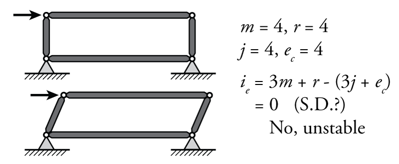 - Internal Determinacy: \begin{align*} m = 2, \; r = 3, \; j = 3, \; e_c = 0 \end{align*} Therefore, \begin{align*} 3m+r = 9 \text{ and } 3j+e_c = 9 \end{align*} so the structure appears internally determinate, but it is still unstable due to the concurrent reactions.