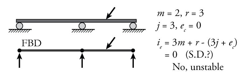 - There are not enough reactions: This will generally be clear from an application of the determinacy equations \eqref{eq:SI-Unstable} to \eqref{eq:SI-Indet} (or \eqref{eq:Truss-Unstable} to \eqref{eq:Truss-Indet} for trusses). \begin{align} \text{Statically unstable internally: } 3m + r &< 3j + e_c \label{eq:SI-Unstable} \tag{1} \\ \text{Statically determinate internally: } 3m + r &= 3j + e_c \label{eq:SI-Det} \tag{2} \\ \text{Statically indeterminate internally: } 3m + r &> 3j + e_c \label{eq:SI-Indet} \tag{3} \end{align} \begin{align} \text{Statically unstable internally (truss): } m + r &< 2j \label{eq:Truss-Unstable} \tag{4} \\ \text{Statically determinate internally (truss): } m + r &= 2j \label{eq:Truss-Det} \tag{5} \\ \text{Statically indeterminate internally (truss): } m + r &> 2j \label{eq:Truss-Indet} \tag{6} \end{align}